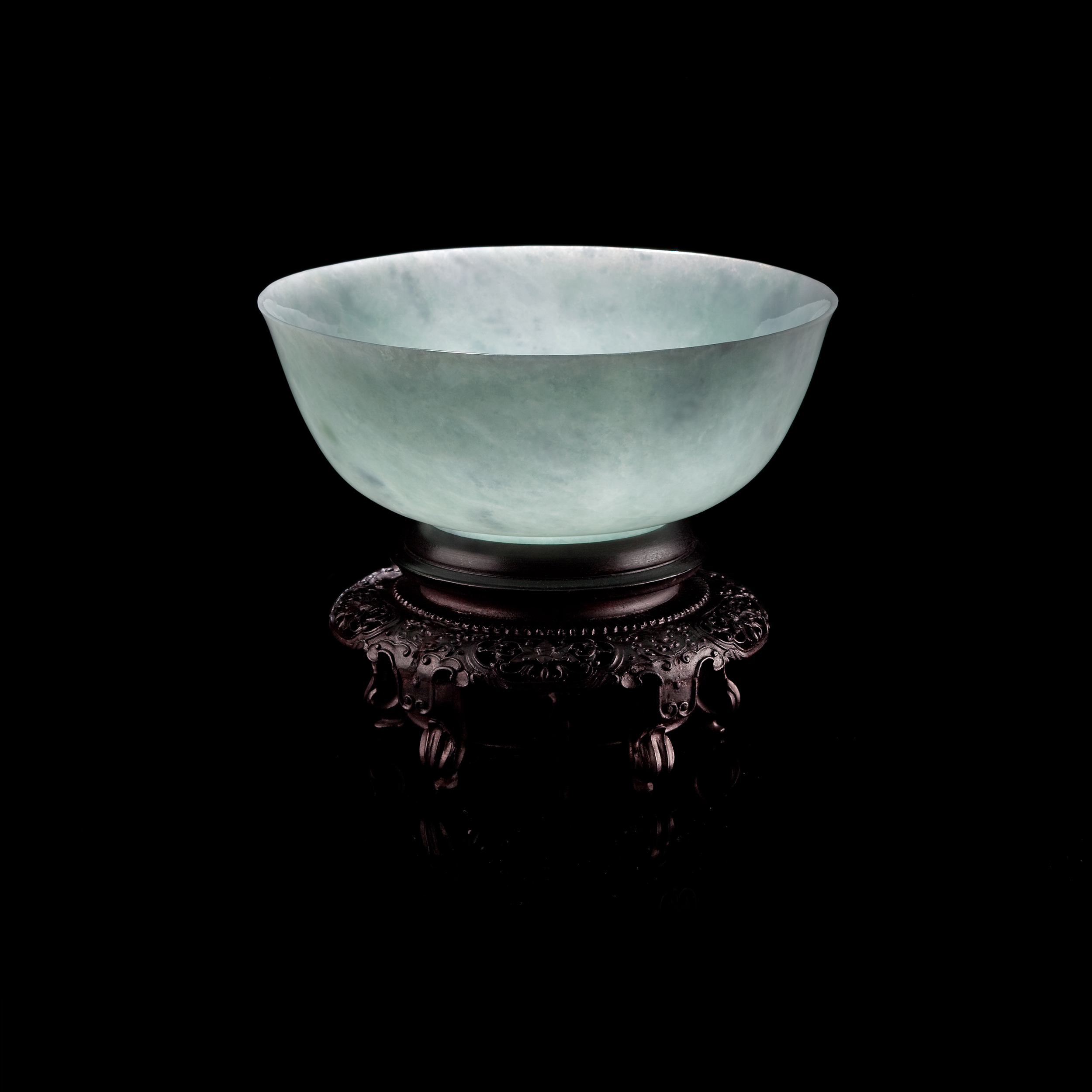 翡翠玉碗,造型看似單純,然則,它的製作過程,卻是耗時、耗力又耗料的考驗。首先,翡翠原石的取得,已愈來愈不容易,玉碗所需要的原石,必須是量體大塊的材料,同時,它的質色還必須達到一定程度的優異性,那就更加增添難度了;即便取得了質色均優的材料,要做出製成「玉碗」的決定,又是另一種艱難,因為,就現今的市場考量,同樣量體的原石,多數會被製成數件手鐲或戒指或墜飾等珠寶飾品,一旦選擇要製成玉碗,那就必須磨掉不少珍貴玉料,這是一項寧願捨棄玉料而成就美學的抉擇。