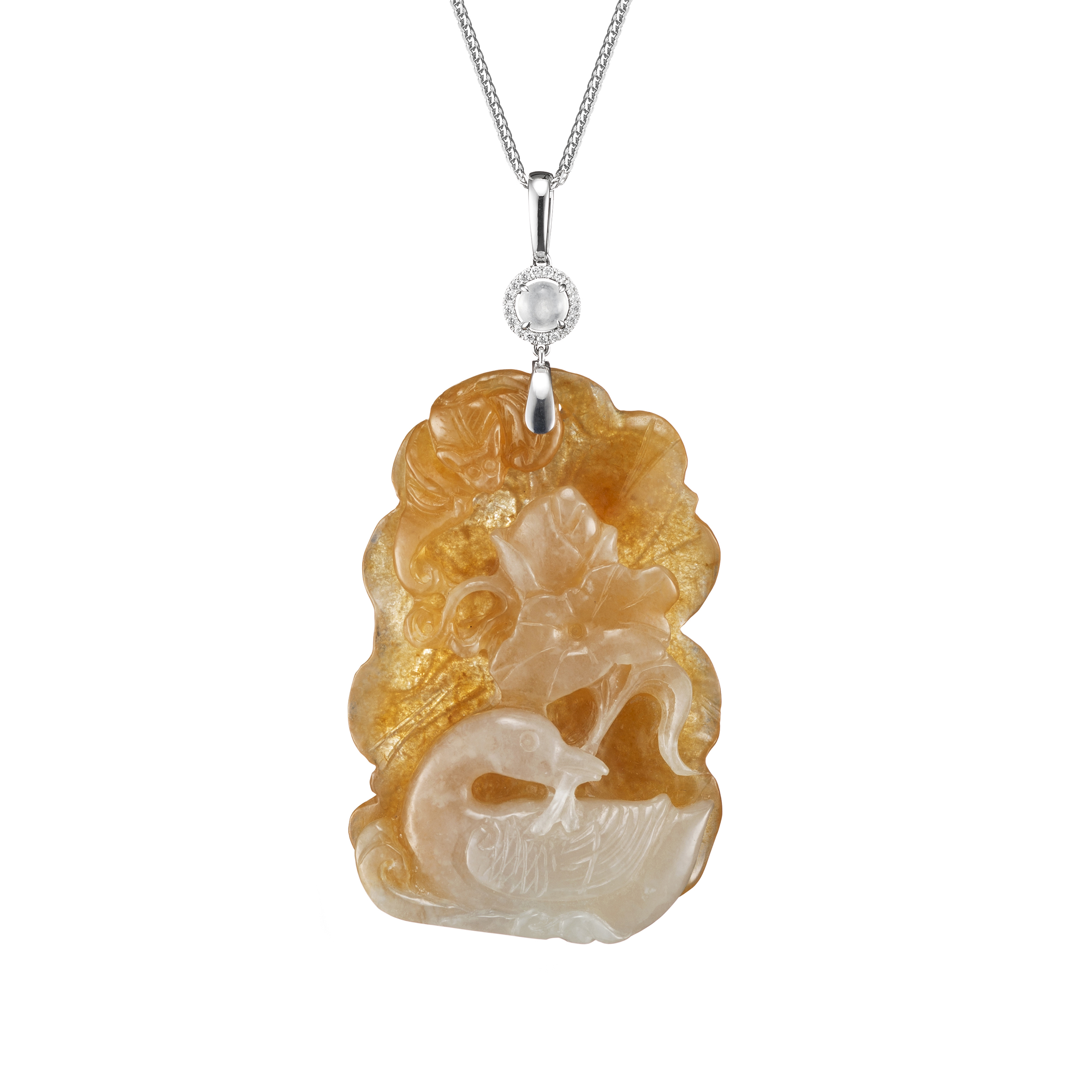 翡翠質色,溫潤多采,以「寶鴨銜蓮」入題,隨色賦形,俏妙變化,無論是珠寶配飾或巧致擺件,都能為這樣的吉祥圖騰增添生色,寶鴨與蓮華蓮蓬、如意或古錢相結合,祥瑞與文趣,精采栩栩。