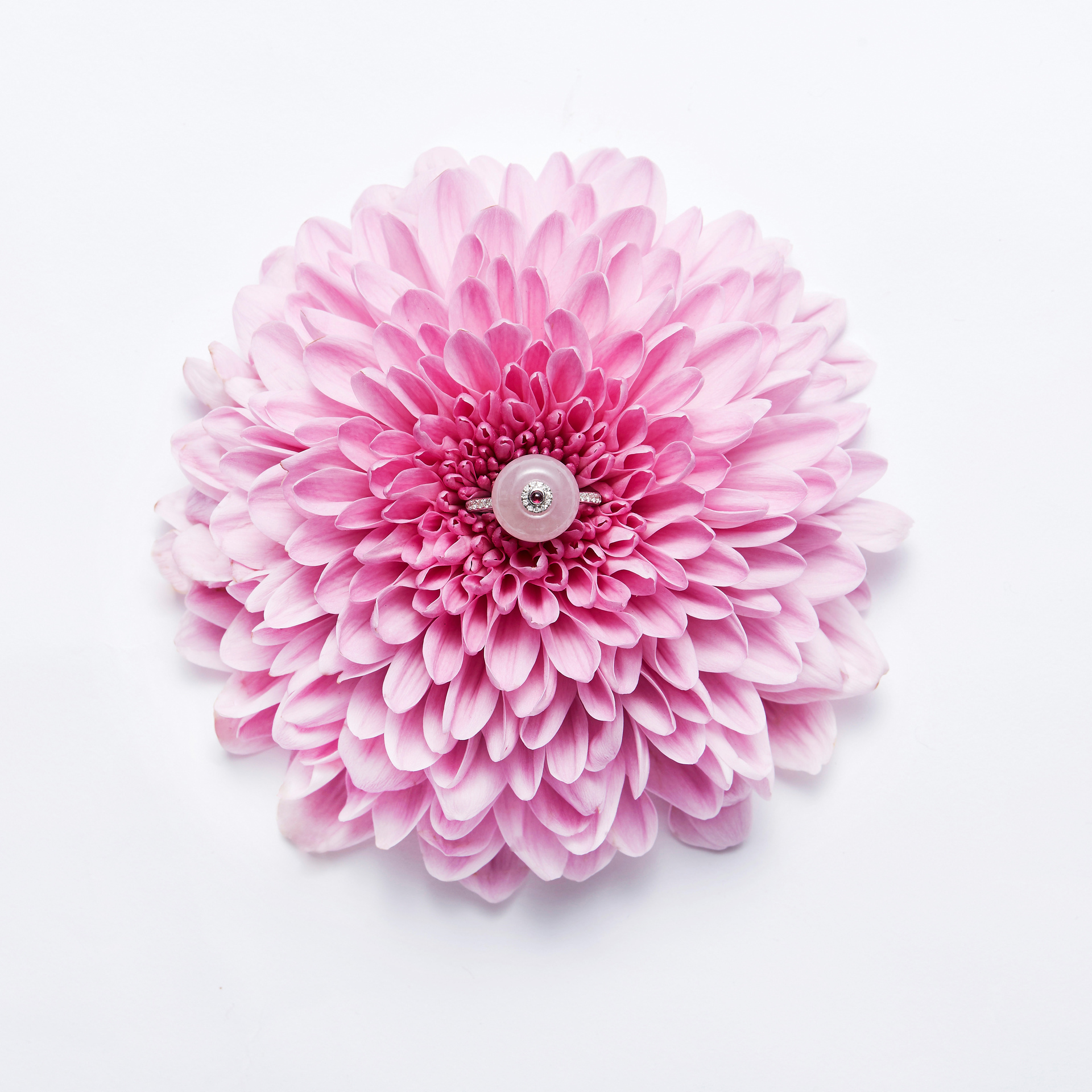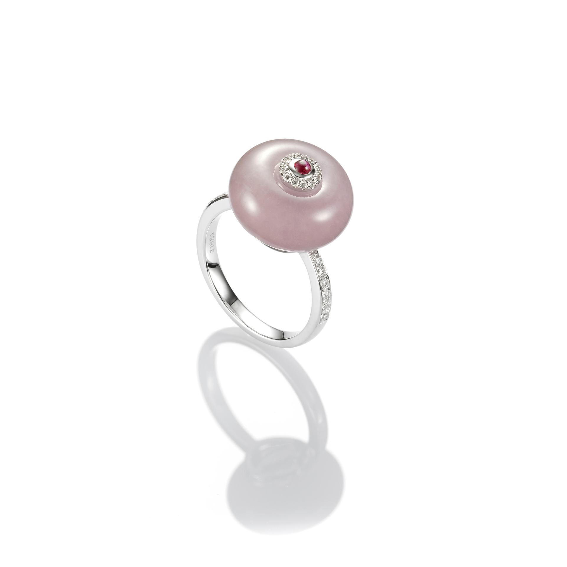 紫羅蘭翡翠又名「春帶彩」,不僅質地溫潤細緻、顏色淡雅浪漫,更蘊含著希望與憧憬的嶄新意象。【滿園春】結合翡翠與時尚的本質,在珠寶的設計細節方面,白K金線戒柔和而順暢的線條樣式,搭配圓形飽滿的紫羅蘭翡翠主石,相互映襯間散發出簡單優雅又獨特的新春之美,再嵌入紅寶石與鑽石點襯,更增添了璀璨、華貴的丰采!