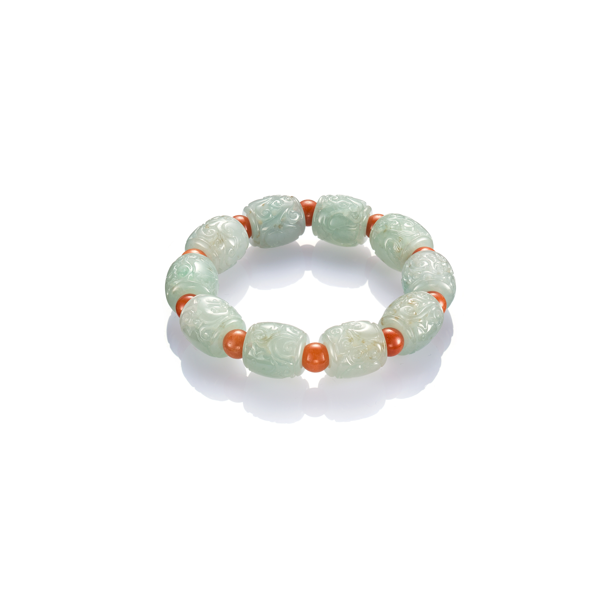 翡翠珠串,內蘊著獨特的文化本質,形制可溯及佛教念珠,既寄寓了圓滿的精神,蘊含著善與美,安定心志使身心不亂,更能做為一種精神的物化承載。其涵養身性的同時兼備了現代的美學設計,搭襯翡翠本身的瑰麗色澤,呈現萬千變化,交織琢磨出翡翠珠串表裡皆美的「珠圓玉潤」,成為彰顯主人文化品味的象徵。